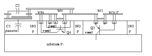 M3 and M2, M4. Due to the cact that most CMOS technologies have no burried