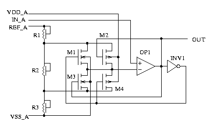 switches the transmission gates M1 to M4 to create the hysteresis. The