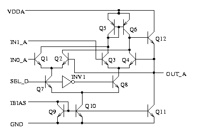 - Q1, Q2, (Q3, Q4) Q5, Q6, Q12 create a unity gain amplifier.